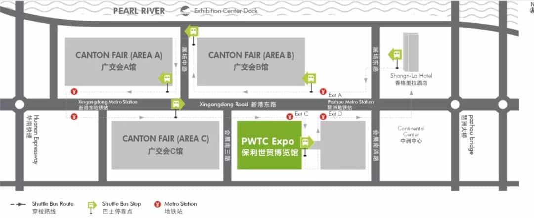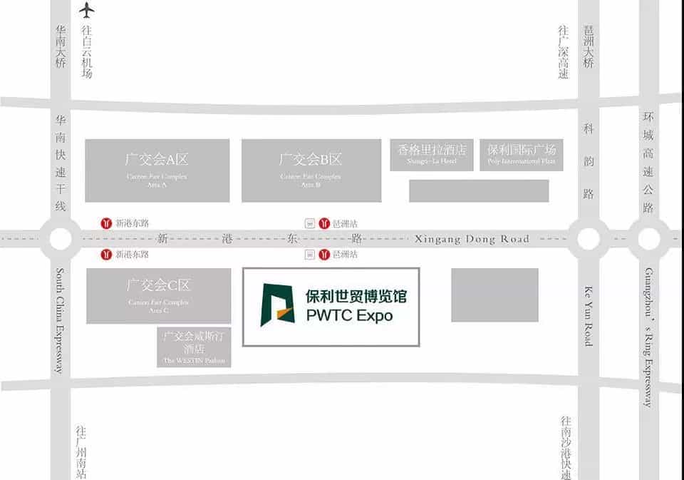 ②搭乘機場快線三號線,于“珀麗酒店”站下車,然后轉(zhuǎn) 乘地鐵8號線抵達“琶洲站”,從C出口出站直達。