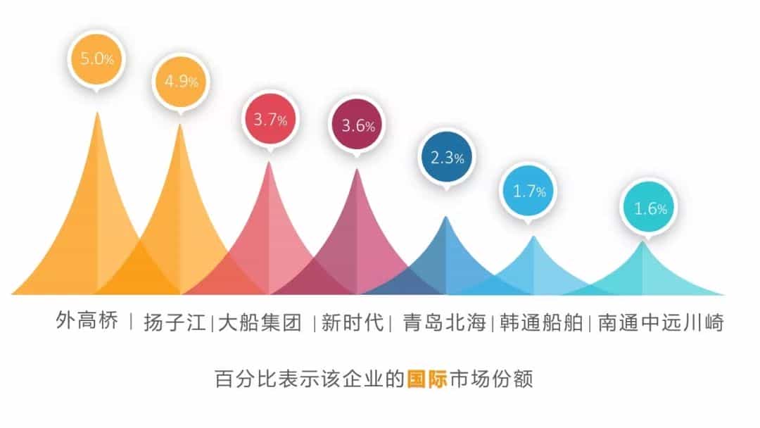 國(guó)際市場(chǎng)份額1.5%以上的中國(guó)企業(yè)中,國(guó)有企業(yè)3家、民營(yíng)企業(yè)3家、合資企業(yè)1家,3家民營(yíng)企業(yè)揚(yáng)子江、新時(shí)代和韓通船舶分別排名第2、第4和第6位,3家企業(yè)全球市場(chǎng)份額之和超過了10%。