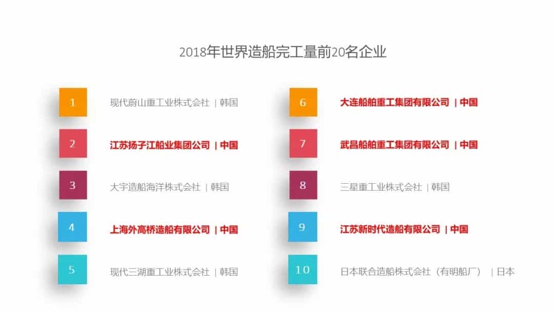 2002年,我國(guó)沒有一家企業(yè)進(jìn)入世界前十大造船企業(yè),到2018年,世界前十大造船企業(yè)中我國(guó)已占有5席。