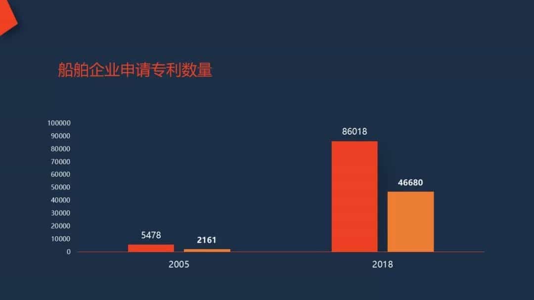創(chuàng)新是支撐船舶企業(yè)轉(zhuǎn)型升級(jí)的主要?jiǎng)恿Γ?span>截止2005年底,我國(guó)船舶企業(yè)申請(qǐng)專利只有5478件,其中發(fā)明專利2161件;截止2018年底,我國(guó)船舶企業(yè)申請(qǐng)專利已達(dá)到86018件,其中發(fā)明專利46680件。