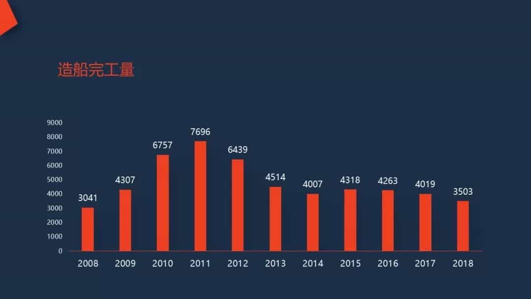 經(jīng)過不懈努力,在市場(chǎng)總量下降的前提下,2010-2018年,中國(guó)造船三大指標(biāo)世界排名仍保持了連續(xù)第一,2018年造船完工量國(guó)際市場(chǎng)份額43.6%,手持訂單世界占有率43.0%。