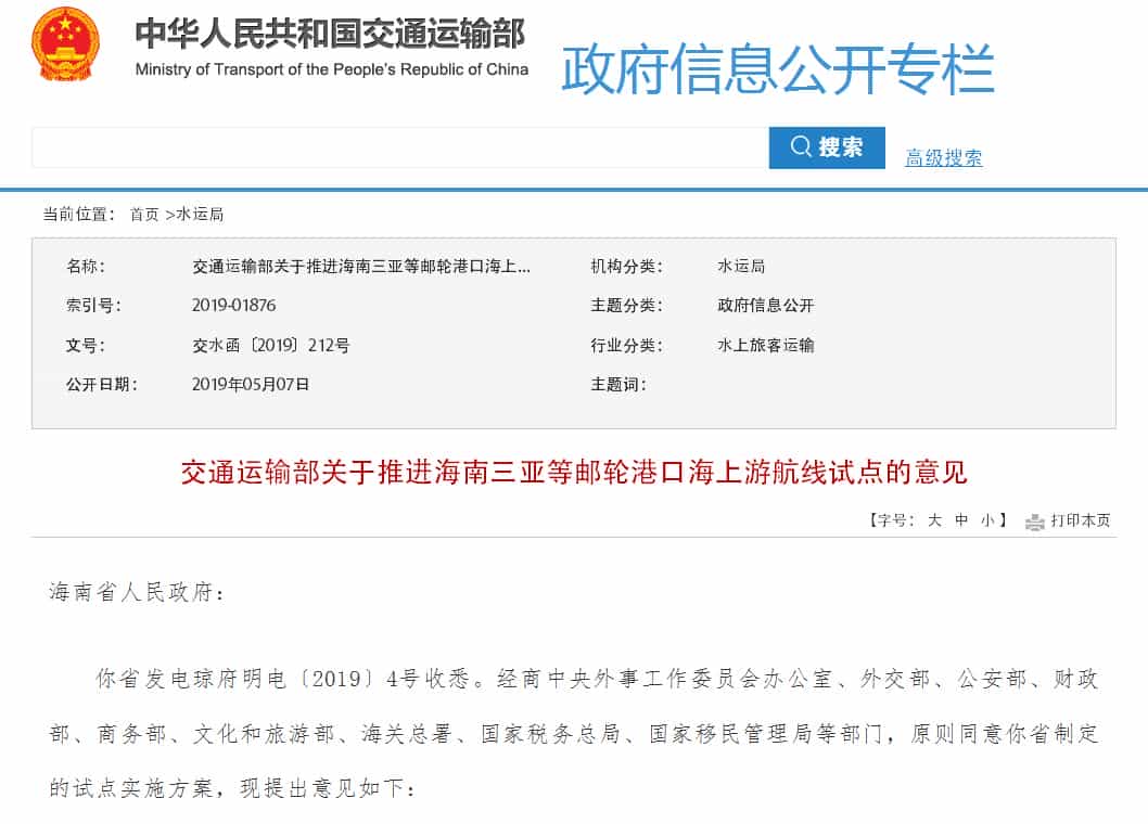 5月7日,交通運輸部發(fā)布《關于推進海南三亞等郵輪港口海上游航線試點的意見》。