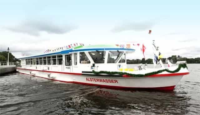 該游船25.5米長、5.36米寬,總重72噸,速度可達8節(jié),推進動力功率為100kW級,由德國Proton Motor 公司提供的2臺48kW電池系統(tǒng)組成,采用35MPa高壓儲氫技術,具備12個氫燃料儲罐,一次可攜帶氫燃料50kg ,可連續(xù)運行2至3天。該船的成功運行證明了氫燃料電池的可靠性。