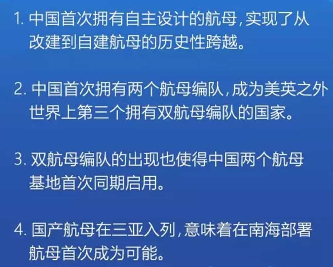 首艘國產(chǎn)航母的入列,標(biāo)志著中國正式進(jìn)入“雙航母時(shí)代”,創(chuàng)造了四個(gè)“首次”,讓人驕傲和鼓舞。
