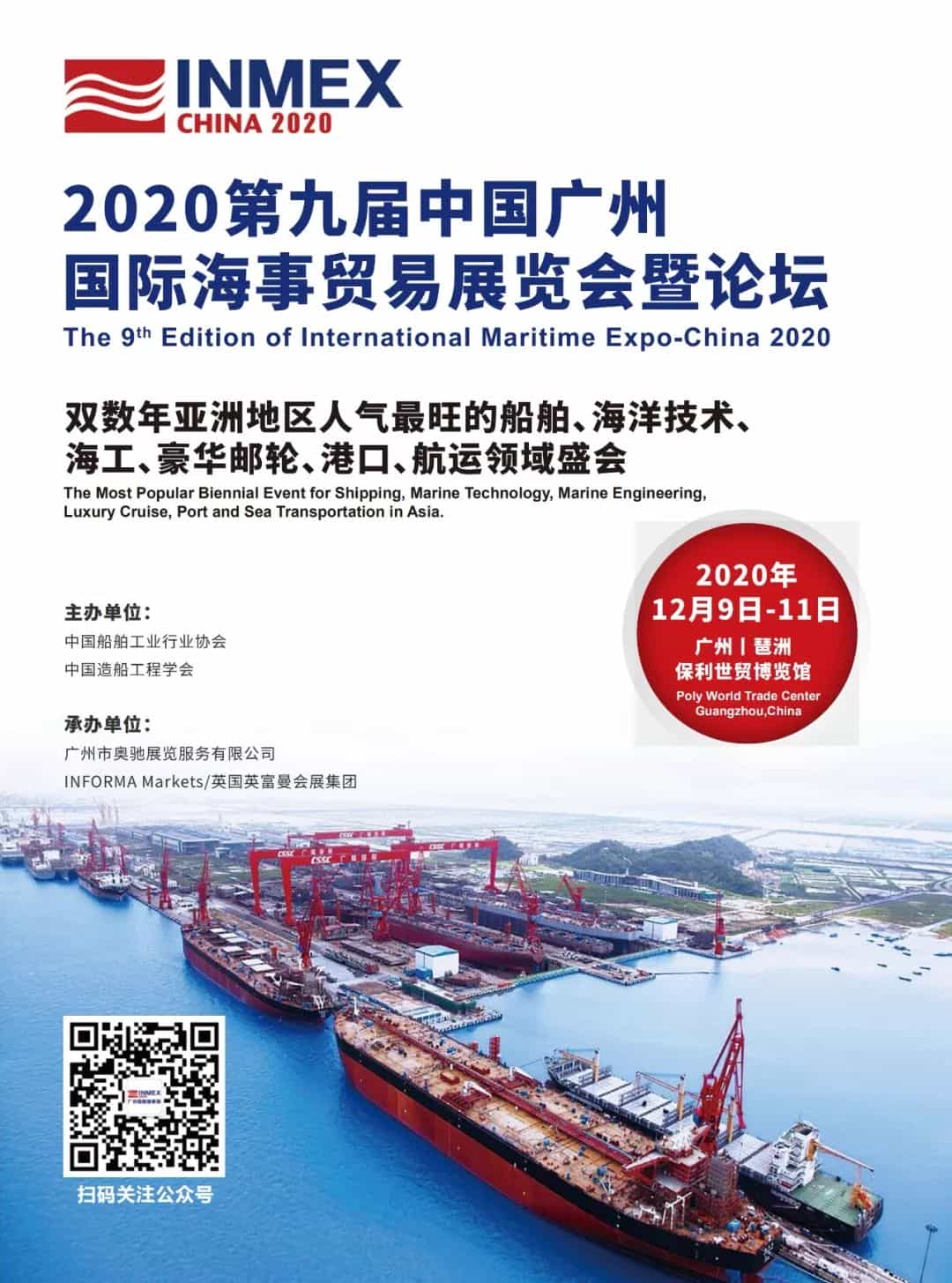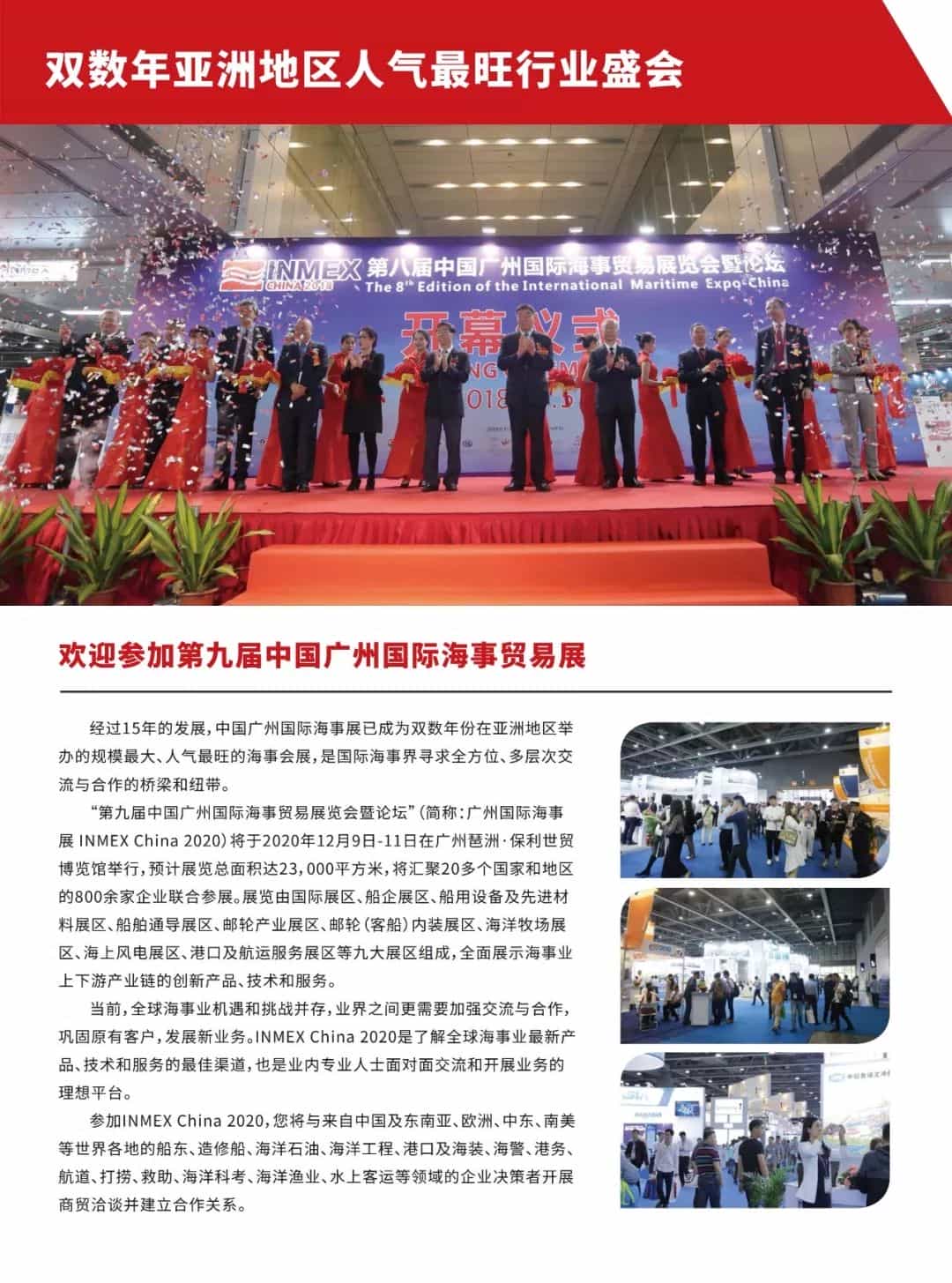 第九屆中國廣州國際海事貿易展覽會暨論壇(簡稱:廣州國際海事展 INMEX China 2020)將于2020年12月9日-11日在廣州琶洲·保利世貿博覽館舉行,預計展覽總面積達23,000平方米,將匯聚20多個國家和地區(qū)的800余家企業(yè)聯(lián)合參展。
