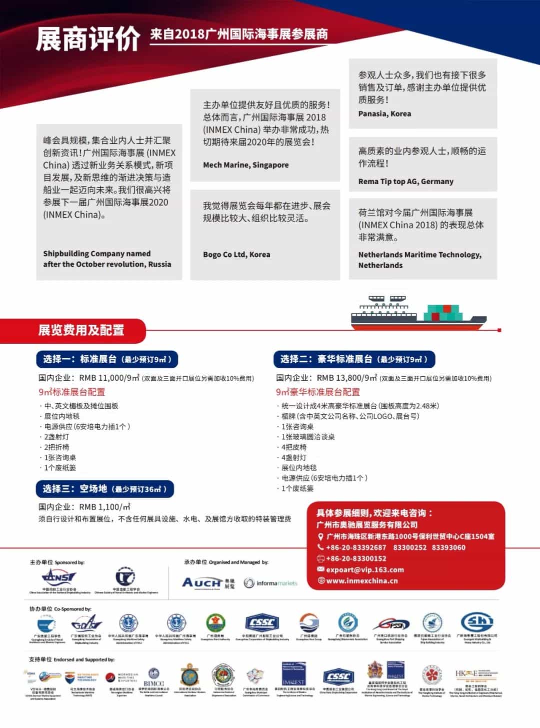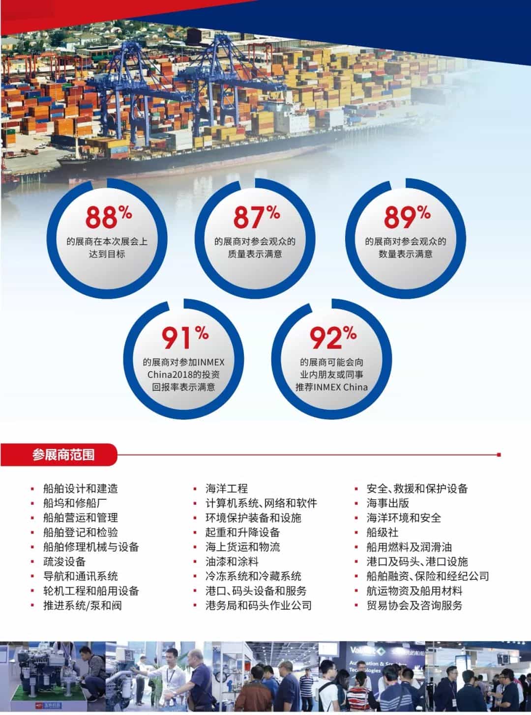 當前,全球海事業(yè)機遇和挑戰(zhàn)并存,業(yè)界之間更需要加強交流與合作,鞏固原有客戶,發(fā)展新業(yè)務。INMEX China 2020是了解全球海事業(yè)最新產品、技術和服務的最佳渠道,也是業(yè)內專業(yè)人士面對面交流和開展業(yè)務的理想平臺。參加INMEX China 2020,您將與來自中國及東南亞、歐洲、中東、南美等世界各地的船東、造修船、海洋石油、海洋工程、港口及海裝、海警、港務、航道、打撈、救助、海洋科考、海洋漁業(yè)、水上客運等領域的企業(yè)決策者開展商貿洽談并建立合作關系。
