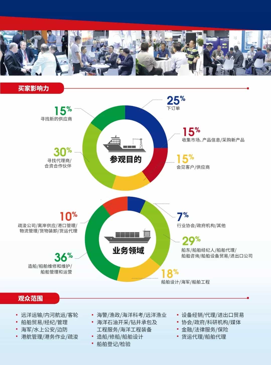 船舶設計和建造、船塢和修船廠、船舶營運和管理、船舶登記和檢驗、船舶修理機械與設備、疏浚設備、導航和通訊系統(tǒng)、輪機工程和船用設備、推進系統(tǒng)/泵和閥、海洋工程計算機系統(tǒng)、網絡和軟件、環(huán)境保護裝備和設施、起重和升降設備、海上貨運和物流、油漆和涂料、冷凍系統(tǒng)和冷藏系統(tǒng)、港口及碼頭設備和服務、港務局和碼頭作業(yè)公司安全、救援和保護設備、海事出版、海洋環(huán)境和安全、船級社、船用燃料及潤滑油、港口及碼頭、港口設施船舶融資、保險和經紀公司、航運物資及船用材料貿易、協(xié)會及咨詢服務等。
