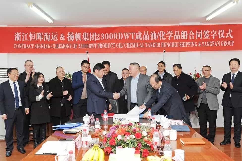 2020年1月1日,揚帆集團與浙江恒暉海運簽署了一艘23,000噸級成品油兼化學品船建造合同。該船型總長159.20米,型寬24.80米,型深13.85米,結(jié)構(gòu)吃水9.80米,最大23,000載重噸,液貨艙艙容達27,000立方米。該船可裝載輕汽油、柴油、2類化學品等貨品。