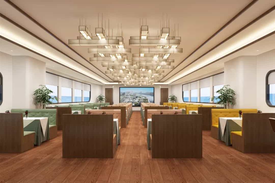 作為首批由國家交通部海事局正式批復(fù)并通過中國船級社CCS認(rèn)證的純電池動力游船,486客位純電動客船采用現(xiàn)代豪華游船的創(chuàng)新設(shè)計理念,滿足觀光游覽、接待、商務(wù)、慶典等綜合功能。該船主體為全鋼質(zhì)雙體焊接結(jié)構(gòu),采用全通透設(shè)計,設(shè)兩層甲板,整船總長42.5m,型寬12.5m,型深3.3m,為全電力全回轉(zhuǎn)對轉(zhuǎn)舵槳雙機推進,航速10.0kn,建成后將躋身全國示范式純電動游船行列,成為珠江夜游的又一極具代表性的名片!