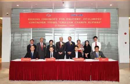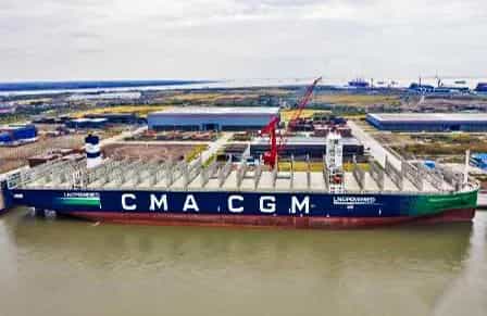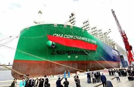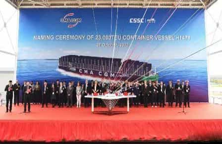 作為法國(guó)達(dá)飛輪船的聯(lián)合賣方,中國(guó)船舶集團(tuán)旗下江南造船和中國(guó)船舶工業(yè)貿(mào)易有限公司建造的23000TEU超大型雙燃料集裝箱船“達(dá)飛香榭·麗舍(CMA CGM CHAMPS ELYSEES)”號(hào)于10月27日正式命名交付。