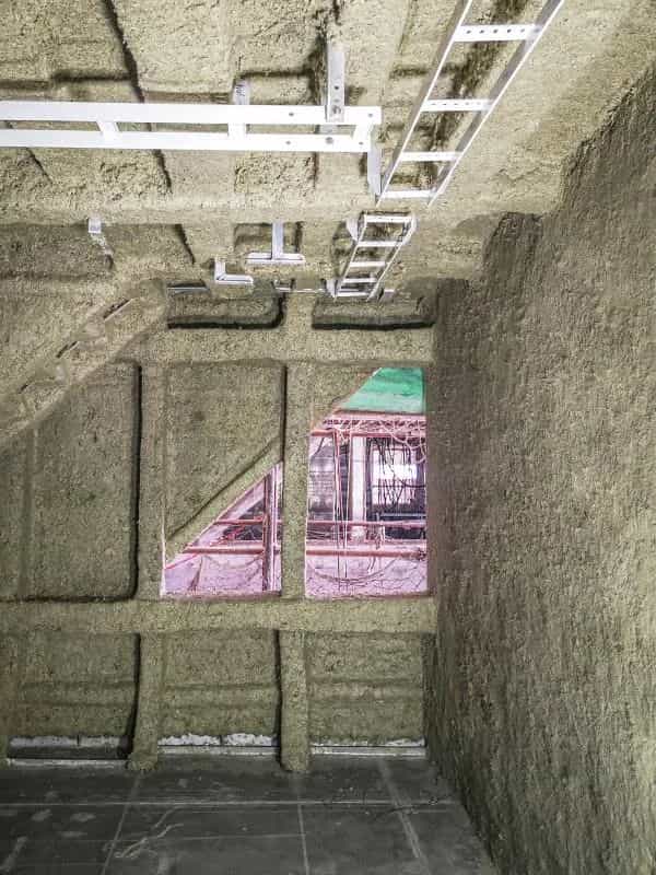 上圖采用SprayMix S超細耐高溫巖棉與雙組份水基膠粘劑GPA和GPB并經(jīng)專業(yè)設備噴涂而成。SprayMix S呈灰綠色,名義密度140kg/m3,熔點1200℃。絕熱系數(shù)為0.038 W/m℃,30mm平均隔聲量為43db。按IMO 2010 FTP PART 1檢測,SprayMix S為不燃材料。按IMO 2010 FTP Part 3規(guī)則檢測,噴涂SprayMix S的耐火艙壁、耐火甲板達到A-60耐火等級,對鋼制結構與鋁合金結構均適用。