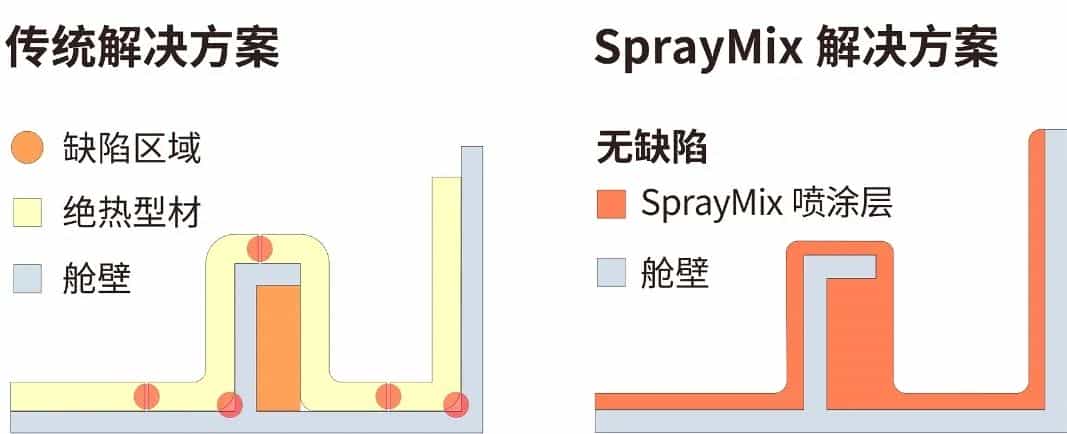 SprayMix噴涂層可與基體緊密粘接,形成一個密閉整體,無接縫,無空洞,可有效阻斷冷熱橋和聲橋,大大提高了絕熱性能與吸音降噪性能。同時,產(chǎn)品克服了傳統(tǒng)保溫型材接縫處、基底鋼板與保溫材料空隙的冷凝結露問題。