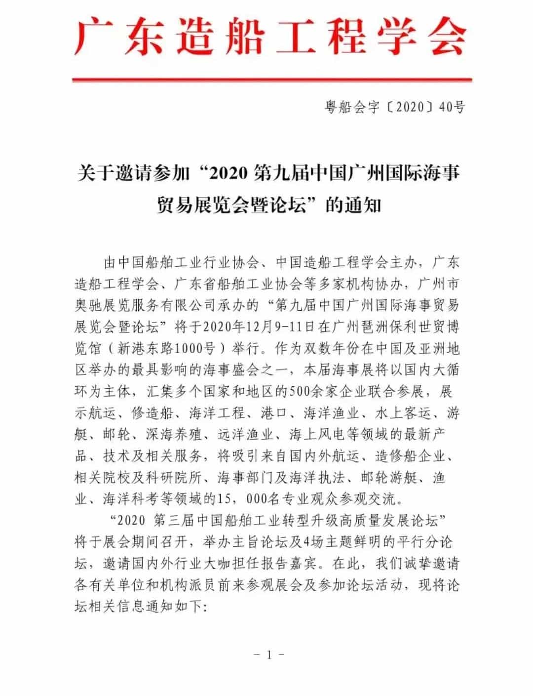 廣東造船工程學(xué)會 | 關(guān)于邀請參加“2020第九屆中國廣州國際海事貿(mào)易展覽會暨論壇”的通知