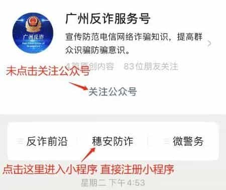 2、“關(guān)注公眾號”,點(diǎn)“穗安防詐”,進(jìn)行注冊