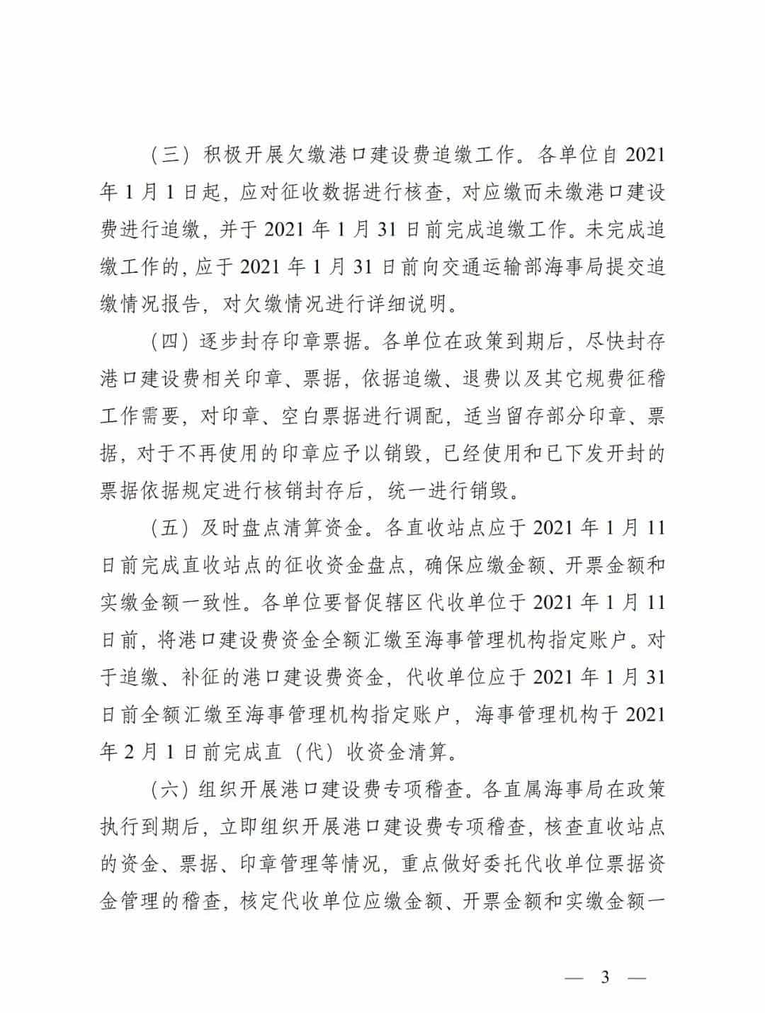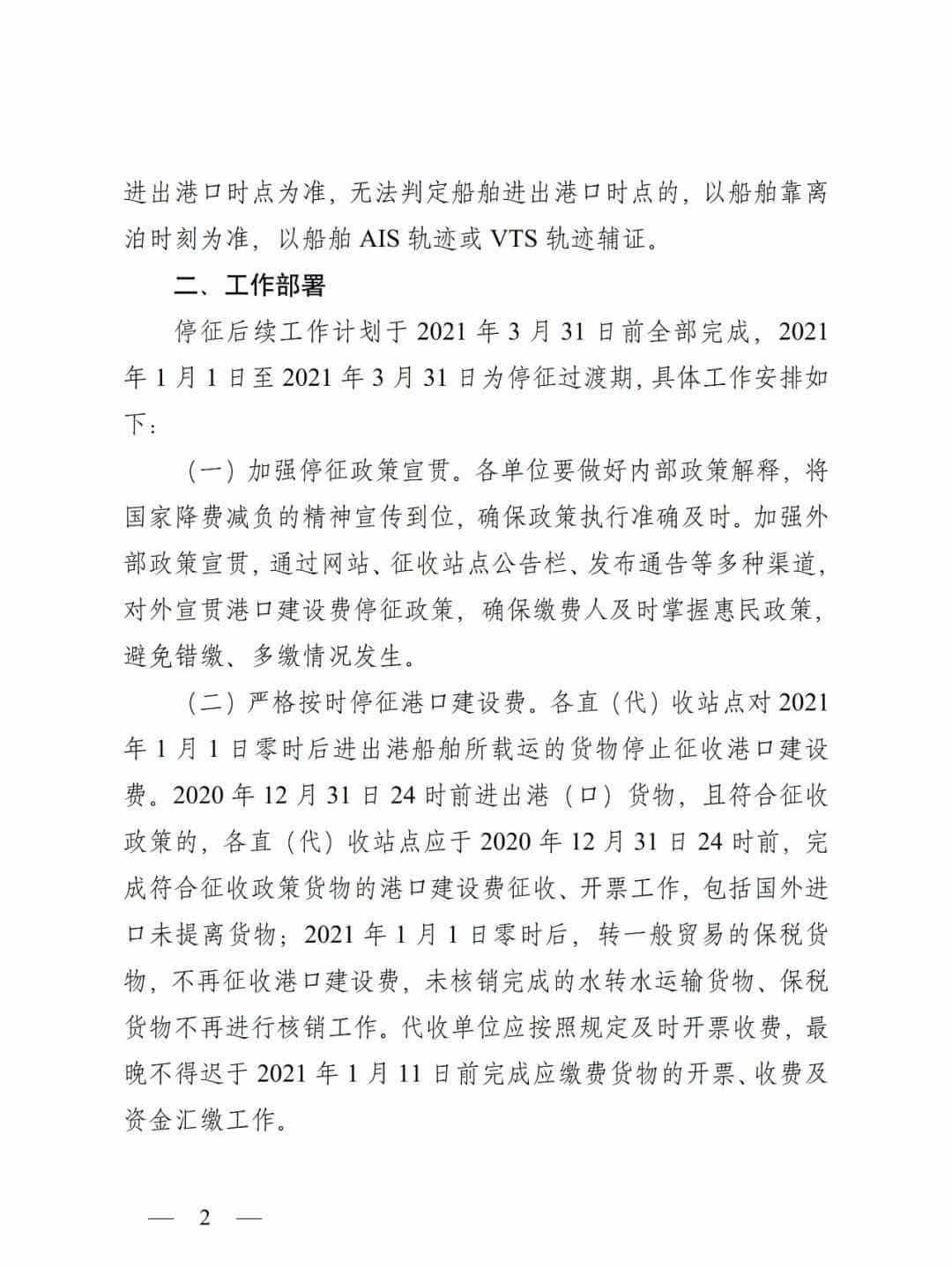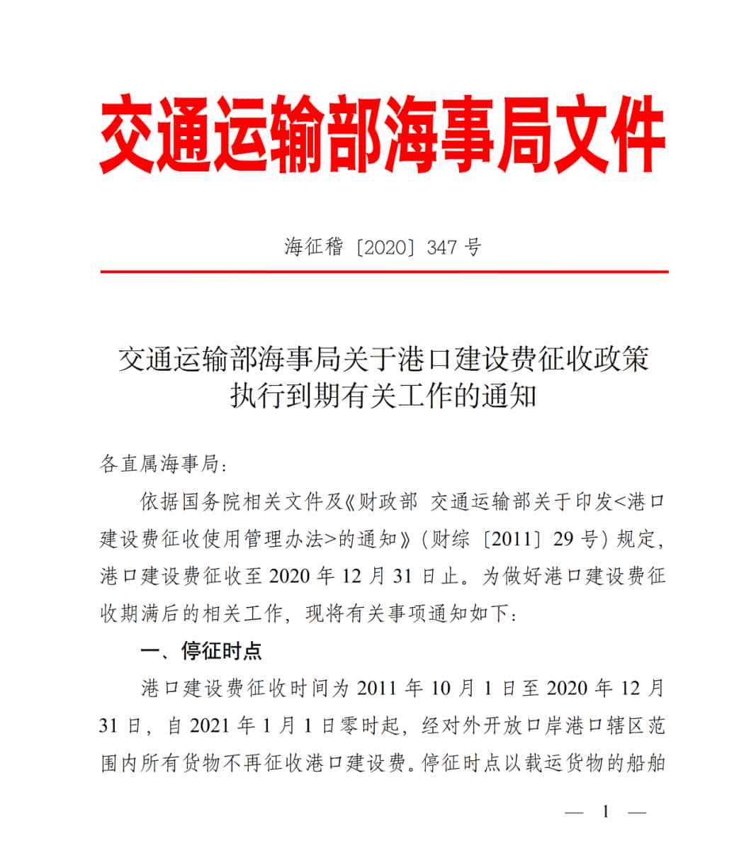 港口建設(shè)費(fèi)征收時(shí)間為2011年10月1日至2020年12月31日,自2021年1月1日零時(shí)起,經(jīng)對(duì)外開放口岸港口轄區(qū)范圍內(nèi)所有貨物不再征收港口建設(shè)費(fèi)。