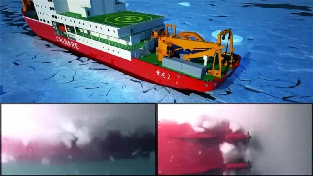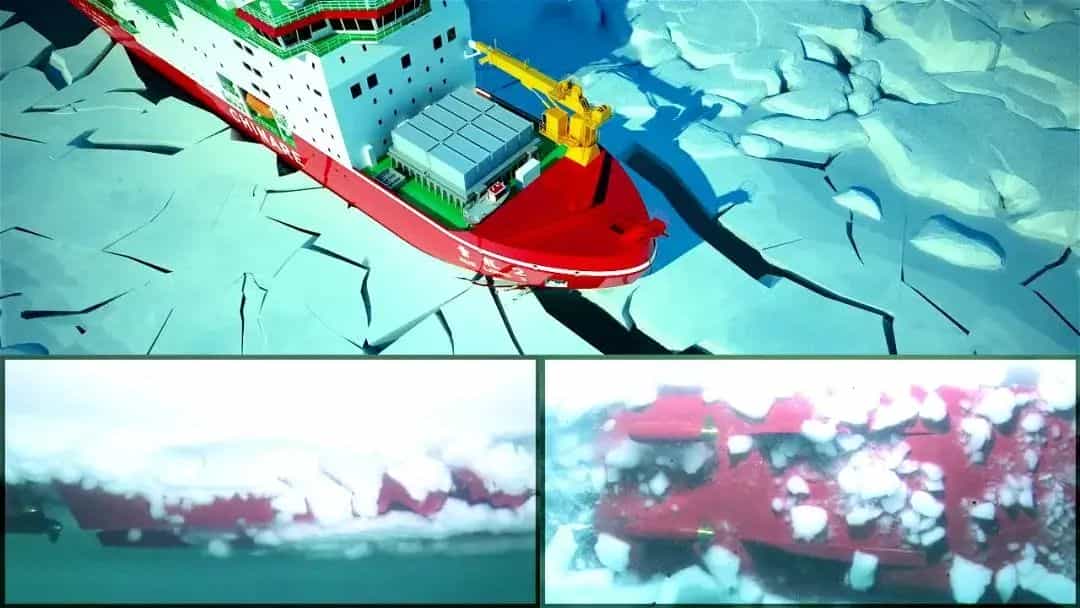 該船融合了國際新一代考察船的技術、功能需求和綠色環(huán)保理念,采用國際先進的船艏船艉雙向破冰船型設計,具備全回轉電力推進功能和沖撞破冰能力,艏向能以2~3節(jié)的航速在冰厚1.5米+雪厚0.2米的條件下連續(xù)破冰航行,艉向可突破極區(qū)20米當年冰冰脊,并可實現(xiàn)極區(qū)原地360°自由轉動。