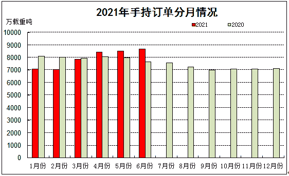 2021年上半年,全國造船完工量2092萬載重噸,同比增長19.0%;承接新船訂單量3824萬載重噸,同比增長206.8%。截至6月底,手持船舶訂單量8660萬載重噸,同比增長13.1%,比2020年底手持訂單增長21.8%。