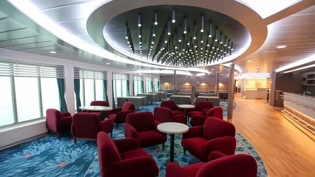 該船除配備了300多間客房外,還擁有各類娛樂設(shè)施、大量公共休閑區(qū)域等。該船上層建筑居住區(qū)采用北歐簡約設(shè)計風(fēng)格,裝飾色彩以冷色調(diào)為主,經(jīng)典耐看,做工精細。