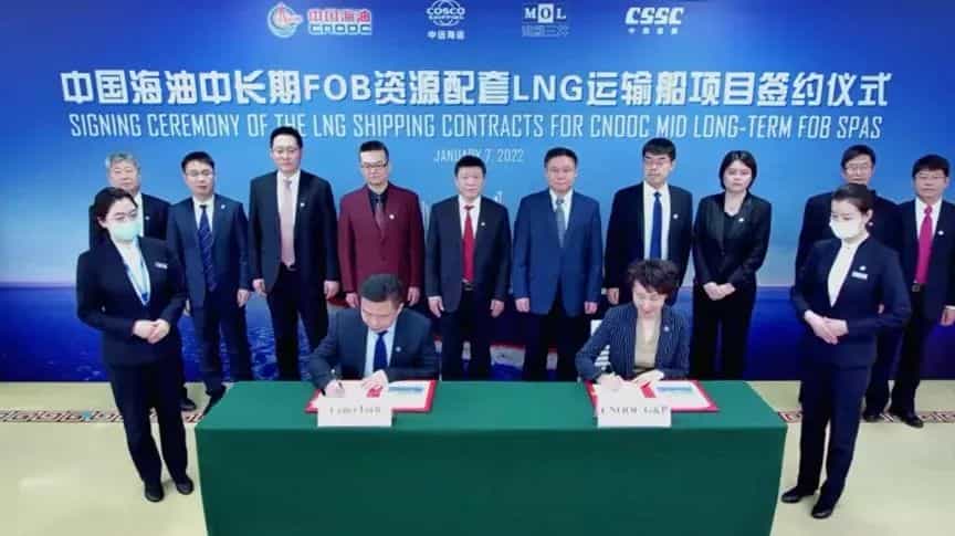 1月7日,“中海油中長期FOB資源配套LNG運輸船項目”簽約儀式在北京、上海和日本東京以視頻連線方式舉行。中國船舶集團有限公司旗下滬東中華造船(集團)有限公司和中國船舶工業(yè)貿(mào)易有限公司作為聯(lián)合賣方,與買方日本商船三井株式會社通過“云簽約”方式,正式簽訂6艘全球最新一代“長恒系列”17.4萬立方米液化天然氣(LNG)運輸船建造合同,金額約75億元人民幣。