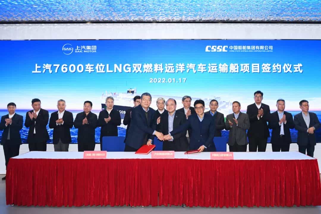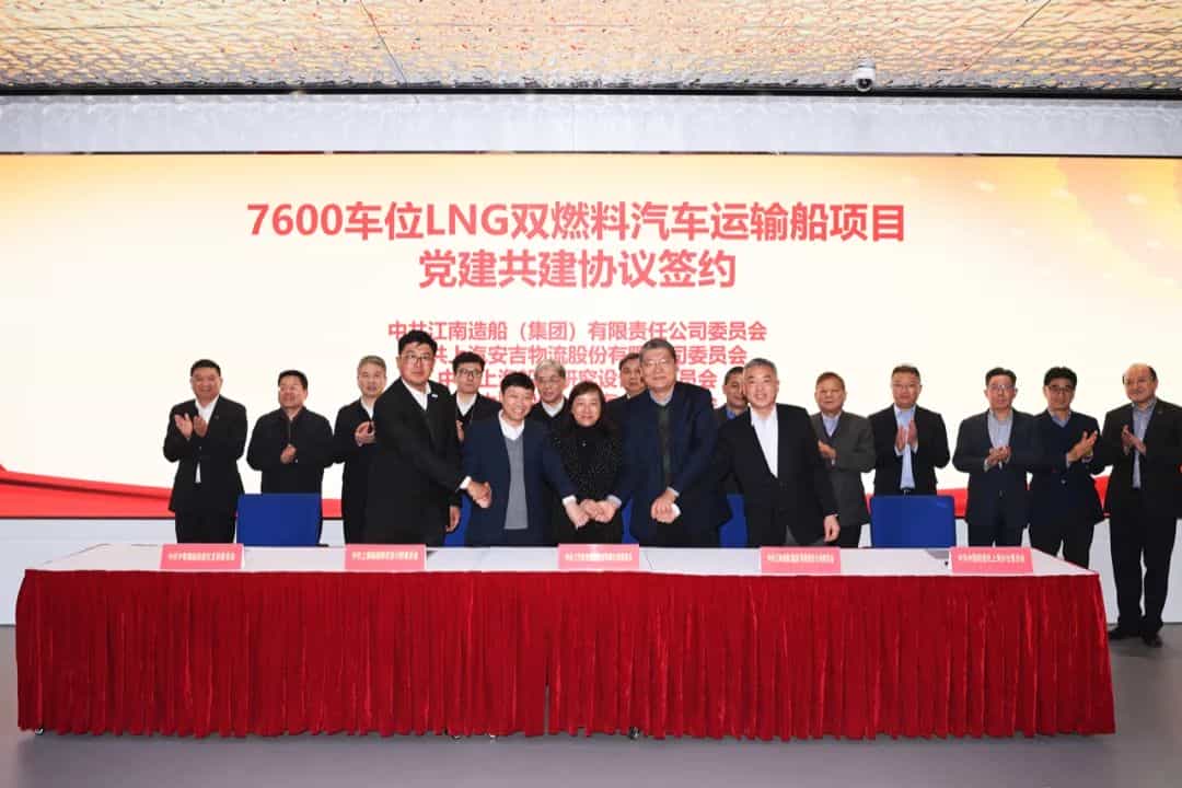 1月17日,中國船舶集團(tuán)有限公司旗下江南造船(集團(tuán))有限責(zé)任公司聯(lián)合中國船舶工業(yè)貿(mào)易有限公司與上海汽車集團(tuán)股份有限公司旗下上汽安吉物流股份有限公司正式簽訂2艘7600車雙燃料動力汽車運輸船(PCTC)建造合同。
