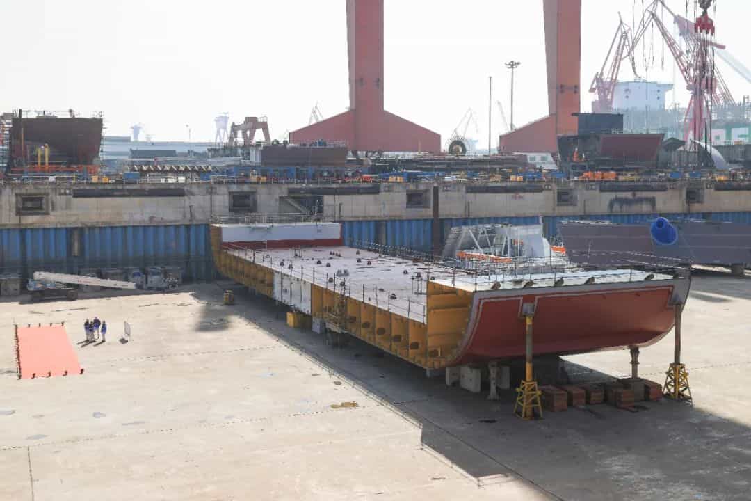 2月14日,中國(guó)船舶集團(tuán)有限公司旗下滬東中華造船(集團(tuán))有限公司建造的全球最大24000TEU超大型集裝箱船7號(hào)船在中船長(zhǎng)興造船基地2號(hào)船塢順利入塢搭載。