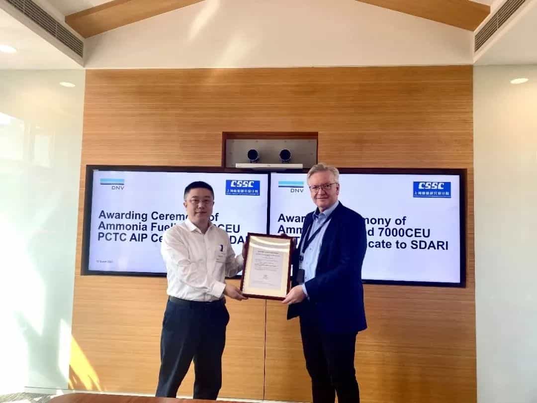 日前,由中國船舶集團有限公司旗下上海船舶研究設計院自主研發(fā)設計的中國首創(chuàng)首款氨燃料動力7000車位汽車運輸船(PCTC)正式獲得DNV頒發(fā)的原則性認可(AiP)證書。