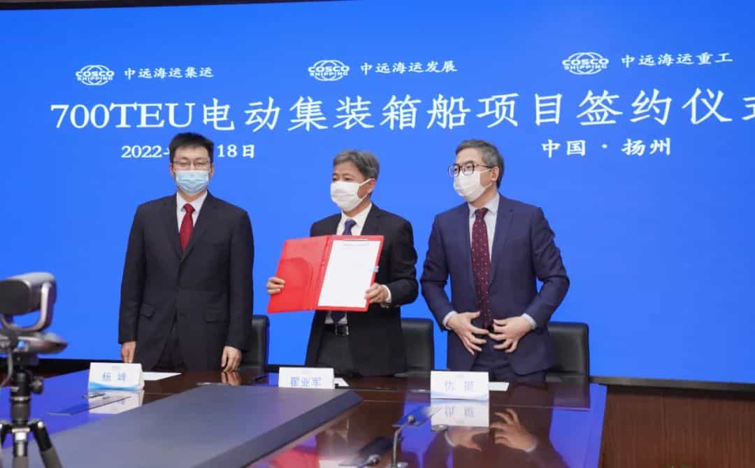 近日,揚州中遠海運重工有限公司與中遠海運發(fā)展股份有限公司通過視頻連線的方式成功簽署2艘700TEU級電動集裝箱船建造合同。根據中遠海發(fā)發(fā)布的公告,該系列船單船價格為5800萬元,2艘合同總價1.16億元。