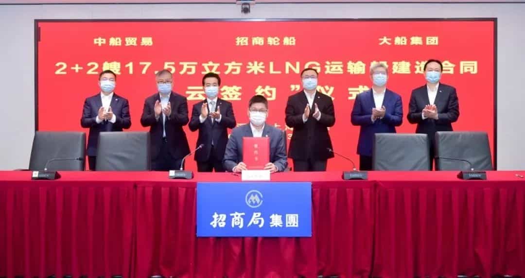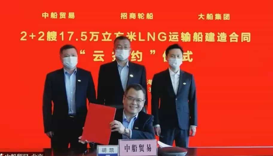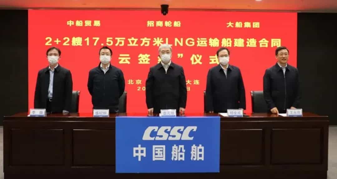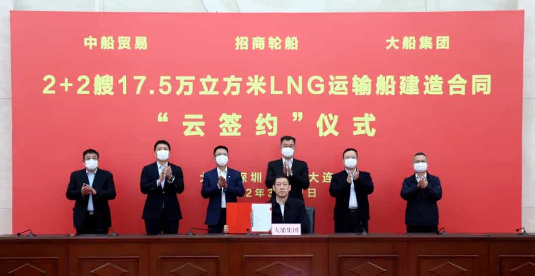 3月31日,中國(guó)船舶集團(tuán)有限公司旗下大連船舶重工集團(tuán)有限公司聯(lián)合中國(guó)船舶工業(yè)貿(mào)易有限公司,與招商局集團(tuán)有限公司旗下招商局能源運(yùn)輸股份有限公司在上海、深圳、大連及北京四地以“云簽約”方式正式簽署2+2艘17.5萬(wàn)立方米大型液化天然氣(LNG)運(yùn)輸船建造合同。