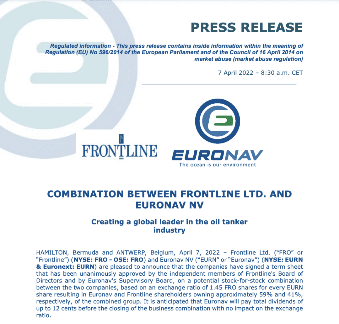 4月7日,國(guó)際知名油輪船東Frontline和Euronav宣布合并。兩家通過股票置換的方式,即1.45股FRO兌換一股EURN合并成新的油輪巨頭,Euronav和Frontline股東將在合并后的公司中分別占股59%和41%。