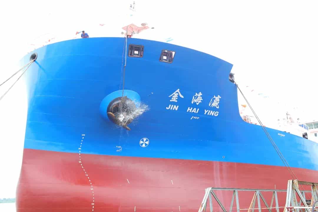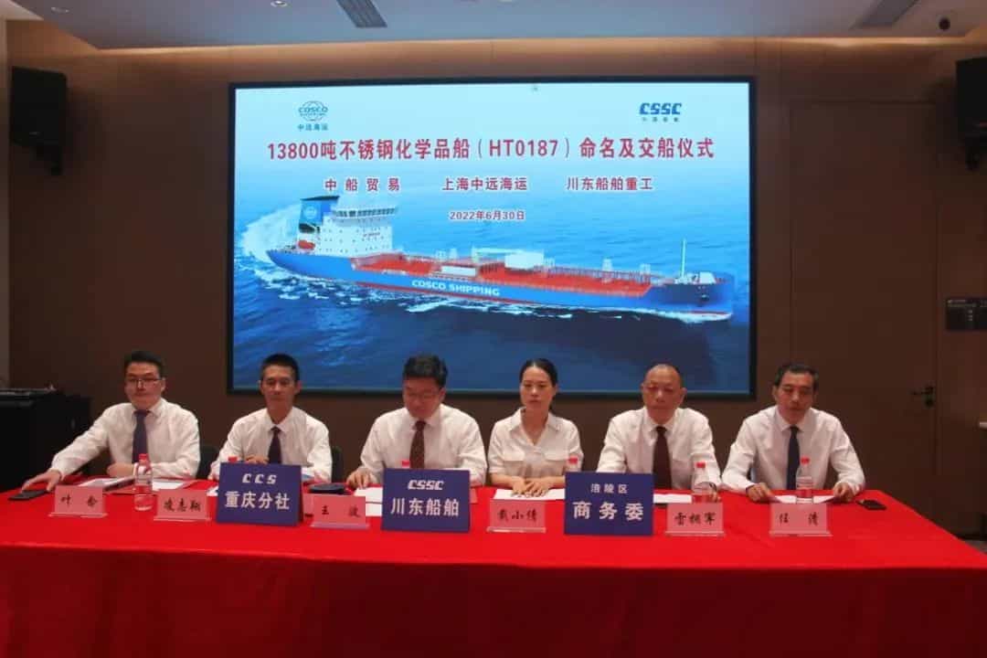 日前,重慶川東船舶重工有限責任公司聯(lián)合中國船舶貿(mào)易工業(yè)有限公司,為中遠海運(上海)有限公司建造的--13800噸不銹鋼化學品船項目首制船“金海瀛”號命名交付。