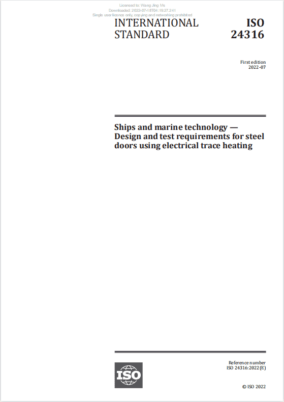 國(guó)際標(biāo)準(zhǔn)為別為:ISO 24316:2022《船舶與海上技術(shù) 船用電伴熱鋼質(zhì)門設(shè)計(jì)與試驗(yàn)要求》;ISO 24319:2022《船舶與海上技術(shù) 船用電伴熱鋼質(zhì)小艙口蓋的設(shè)計(jì)與試驗(yàn)要求》)。