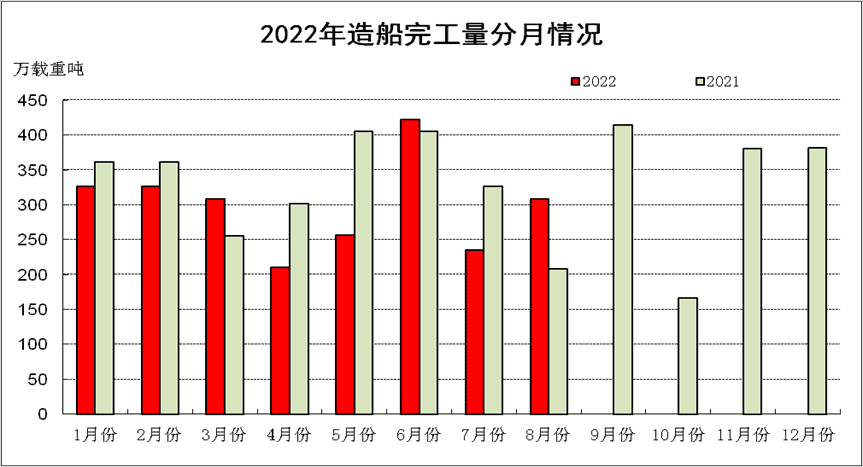 1-8月,50家重點監(jiān)測造船企業(yè)造船完工2291萬載重噸,同比下降10.8%。