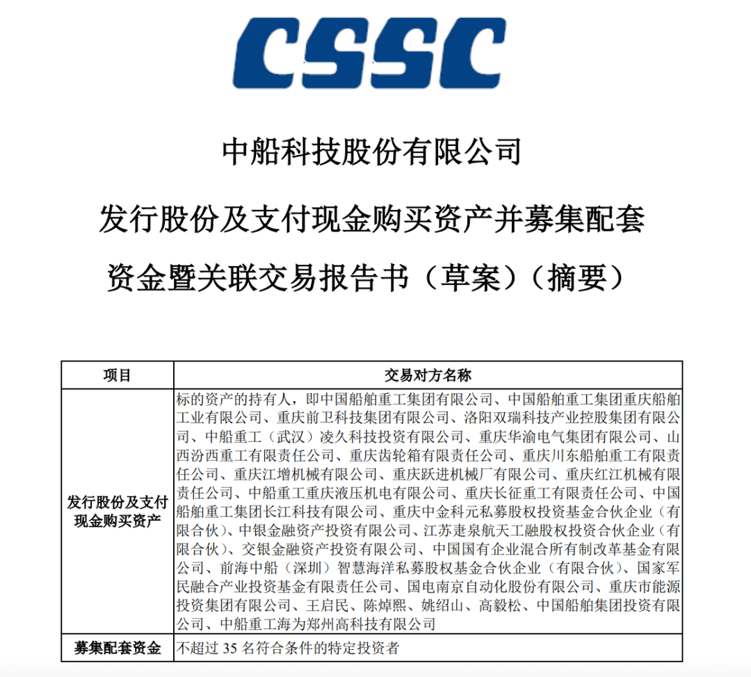 10月10日,中船科技股份有限公司發(fā)布《發(fā)行股份及支付現(xiàn)金購買資產(chǎn)并募集配套資金暨關(guān)聯(lián)交易報告書(草案)》等公告。