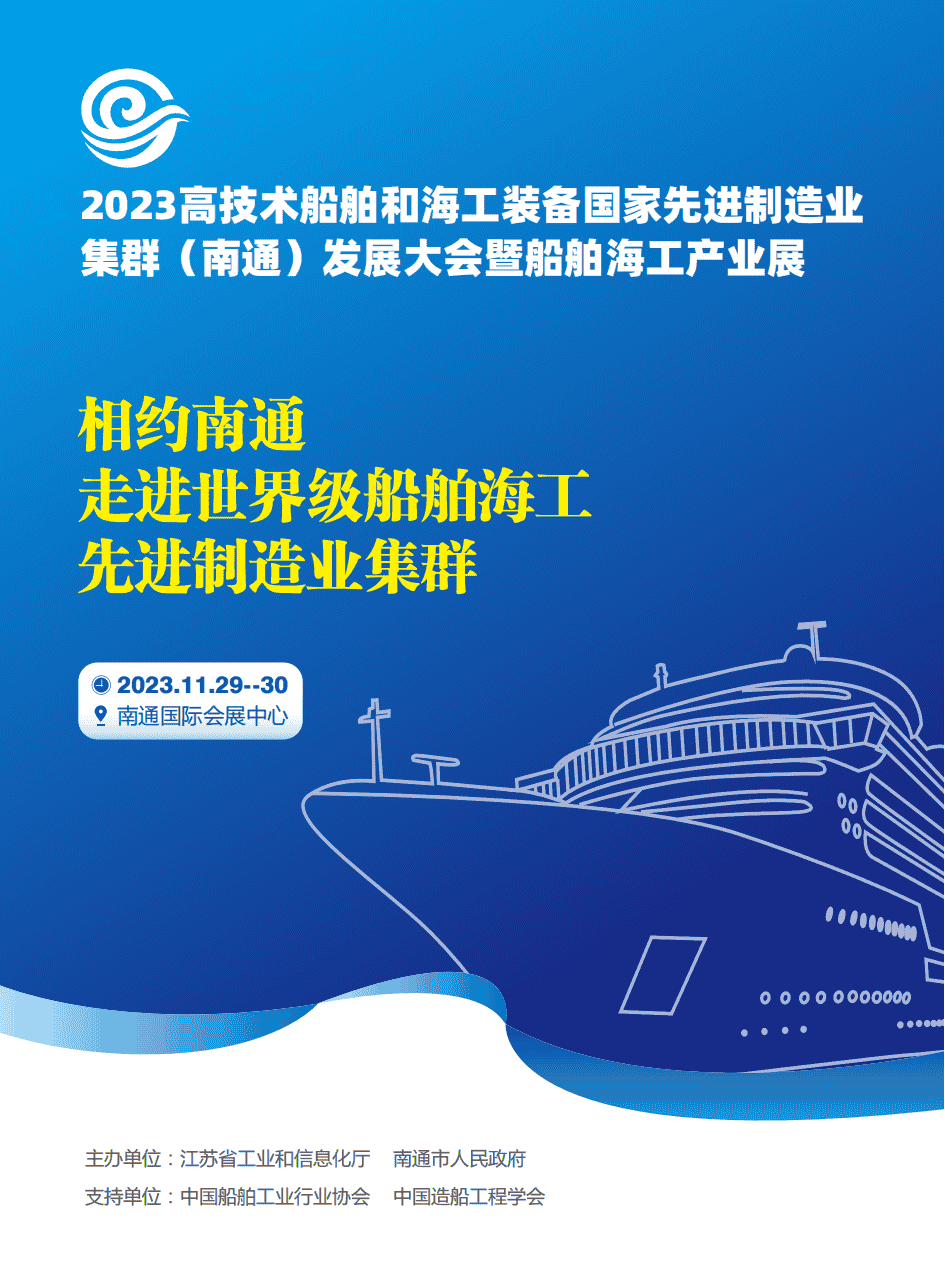 11月29日-30日,“2023高技術(shù)船舶和海工裝備國(guó)家先進(jìn)制造業(yè)集群(南通)發(fā)展大會(huì)暨船舶海工產(chǎn)業(yè)展”,將在南通國(guó)際會(huì)展中心舉行。