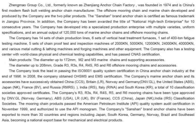 正茂集團(tuán)有限責(zé)任公司前身是鎮(zhèn)江錨鏈廠,始建于1974年,距離上海約2小時(shí)車(chē)程,是中國(guó)首家現(xiàn)代化的電焊錨鏈制造企業(yè)。