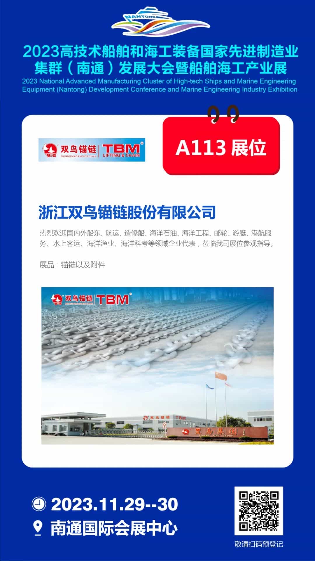 2023年11月29-30日,南通國際會(huì)展中心A113展位,雙鳥錨鏈與全球船舶人相約南通,走向深藍(lán),打造世界級(jí)船舶海工集群!