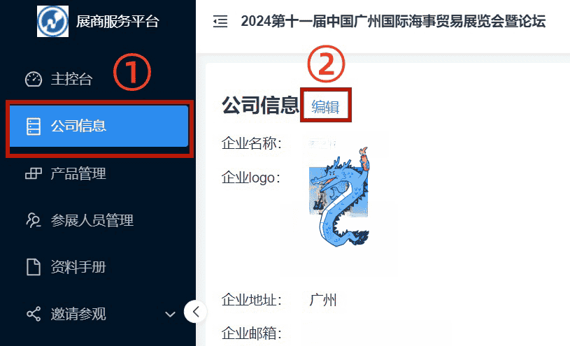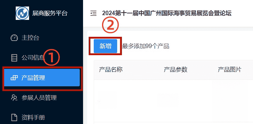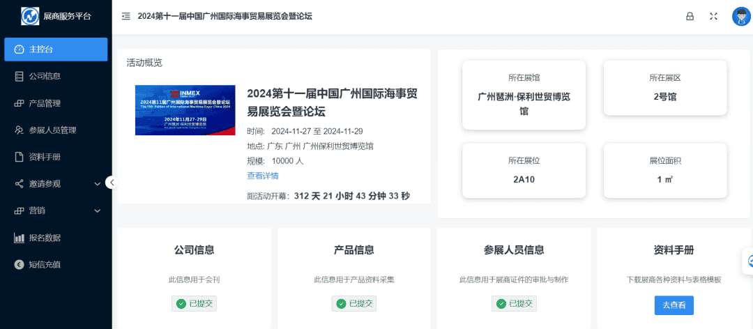 在左側(cè)菜單欄列表中,依次有:主控臺、公司信息、產(chǎn)品管理、參展人員管理、營銷等內(nèi)容,供參展企業(yè)使用。