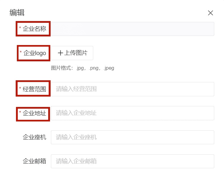 點擊【公司信息】,選擇“編輯”,輸入公司名稱、經(jīng)營范圍、公司地址、聯(lián)系方式等,上傳公司logo。
