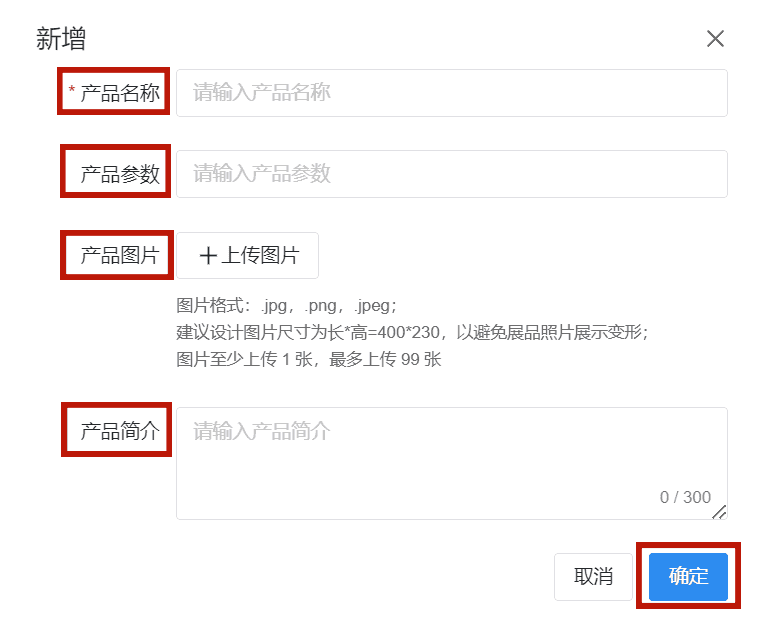 點擊【產(chǎn)品管理】,選擇“新增”,輸入產(chǎn)品名稱、上傳產(chǎn)品圖片,點擊“確定”,保存信息。