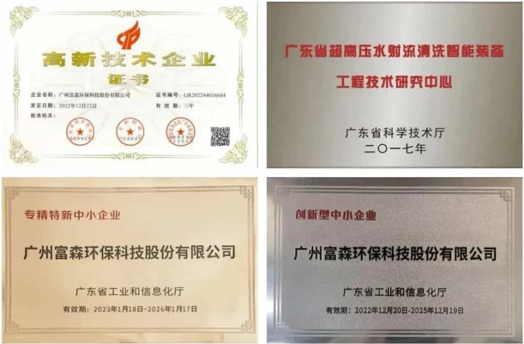 富森環(huán)保于2016年在新三板掛牌,并被認(rèn)定為國家高新技術(shù)企業(yè),2017年被認(rèn)定為廣東省超高壓水射流清洗智能裝備工程技術(shù)研究中心,2022年被認(rèn)定為“專精特新中小企業(yè)”和“創(chuàng)新型中小企業(yè)”。