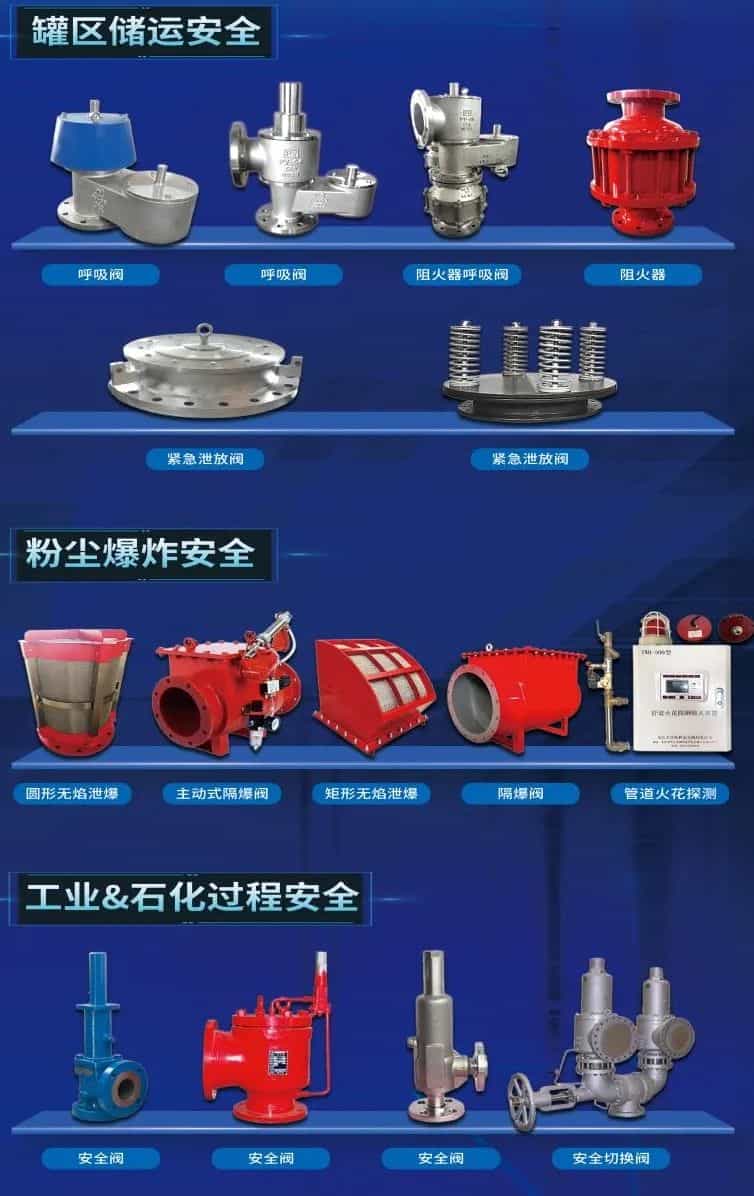 公司致力于壓力容器、鍋爐、常壓儲罐及壓力管道的保護(hù)研究,專業(yè)生產(chǎn)各類安全閥、呼吸閥、阻火器、緊急泄放閥、粉塵背壓隔爆閥、無火焰泄爆裝置、粉塵泄爆閥、火花探測熄滅裝置等工業(yè)爆炸及防護(hù)控爆產(chǎn)品。