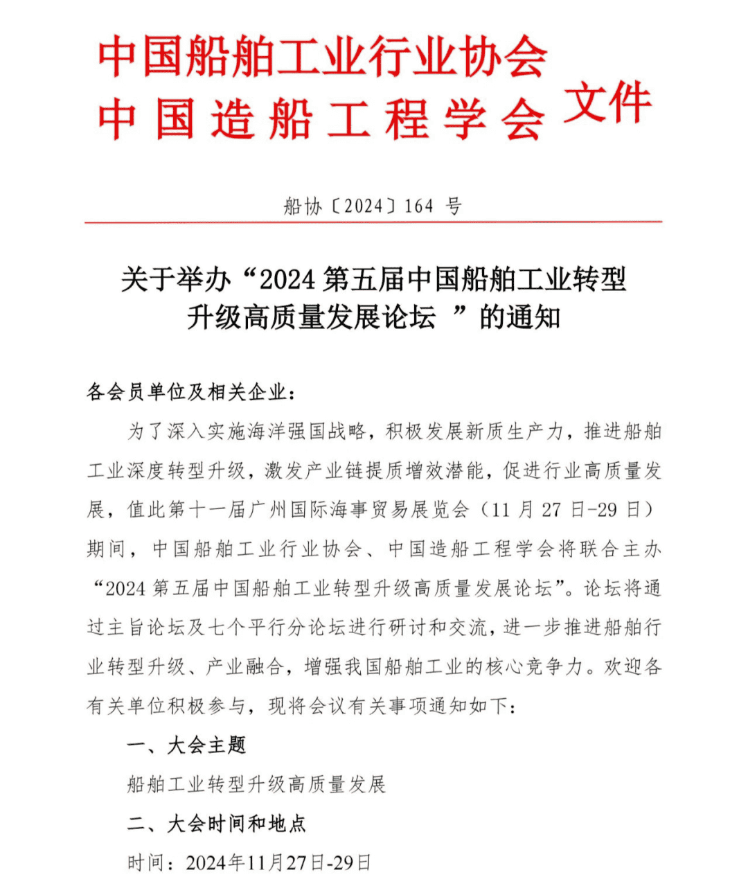 關(guān)于舉辦“2024第五屆中國(guó)船舶工業(yè)轉(zhuǎn)型升級(jí)高質(zhì)量發(fā)展論壇”的通知