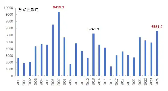 以修正總噸計(jì),2024年全球新船訂單量已超過(guò)2013年的6241.9萬(wàn)修正總噸,創(chuàng)2008年以來(lái)的新高。
